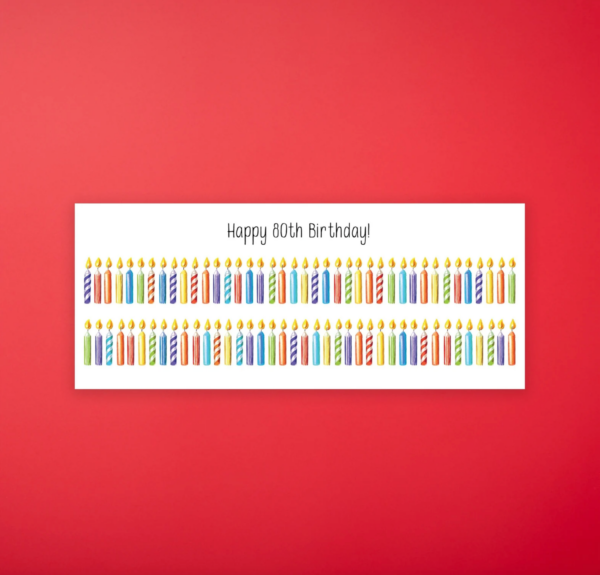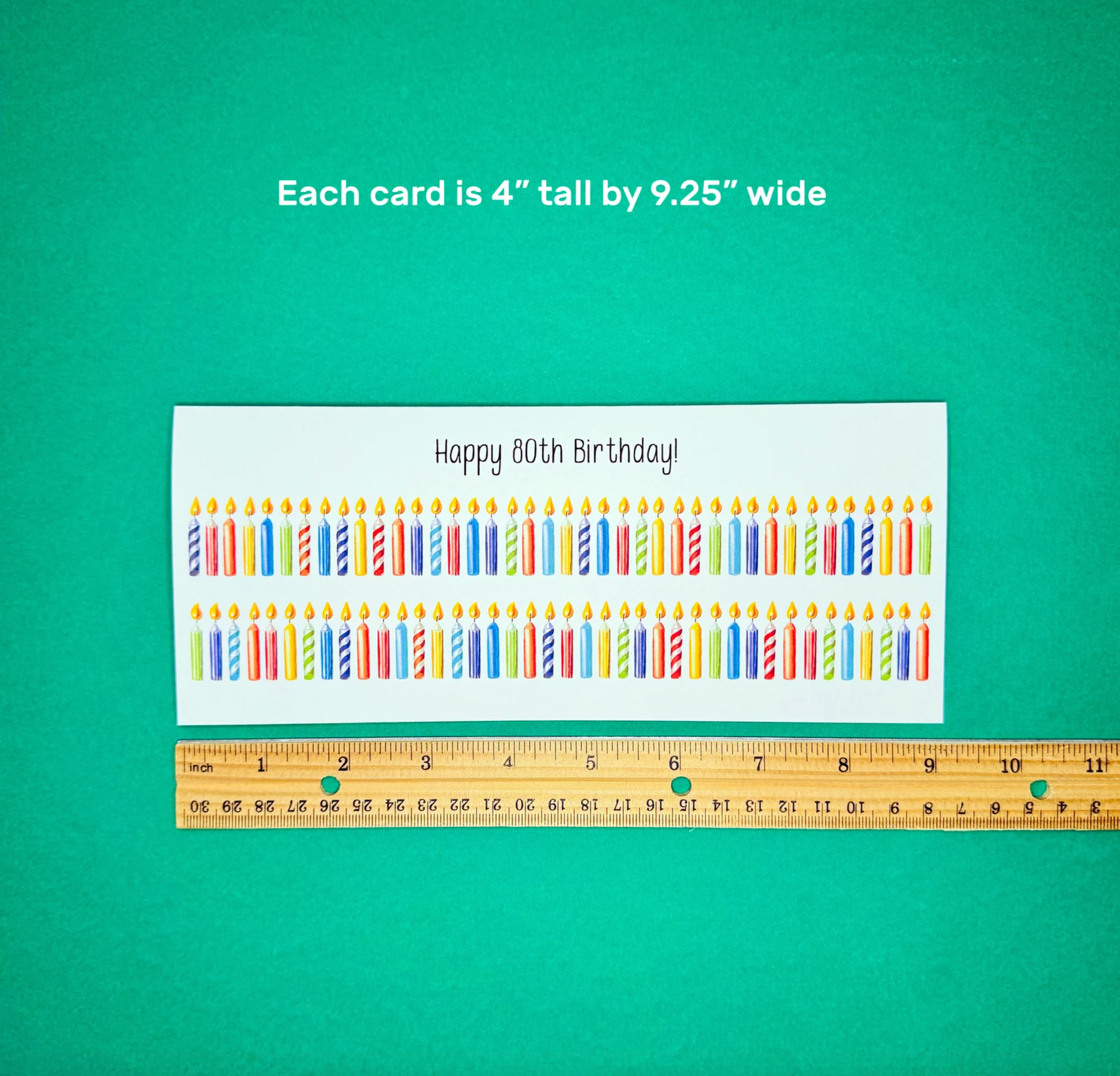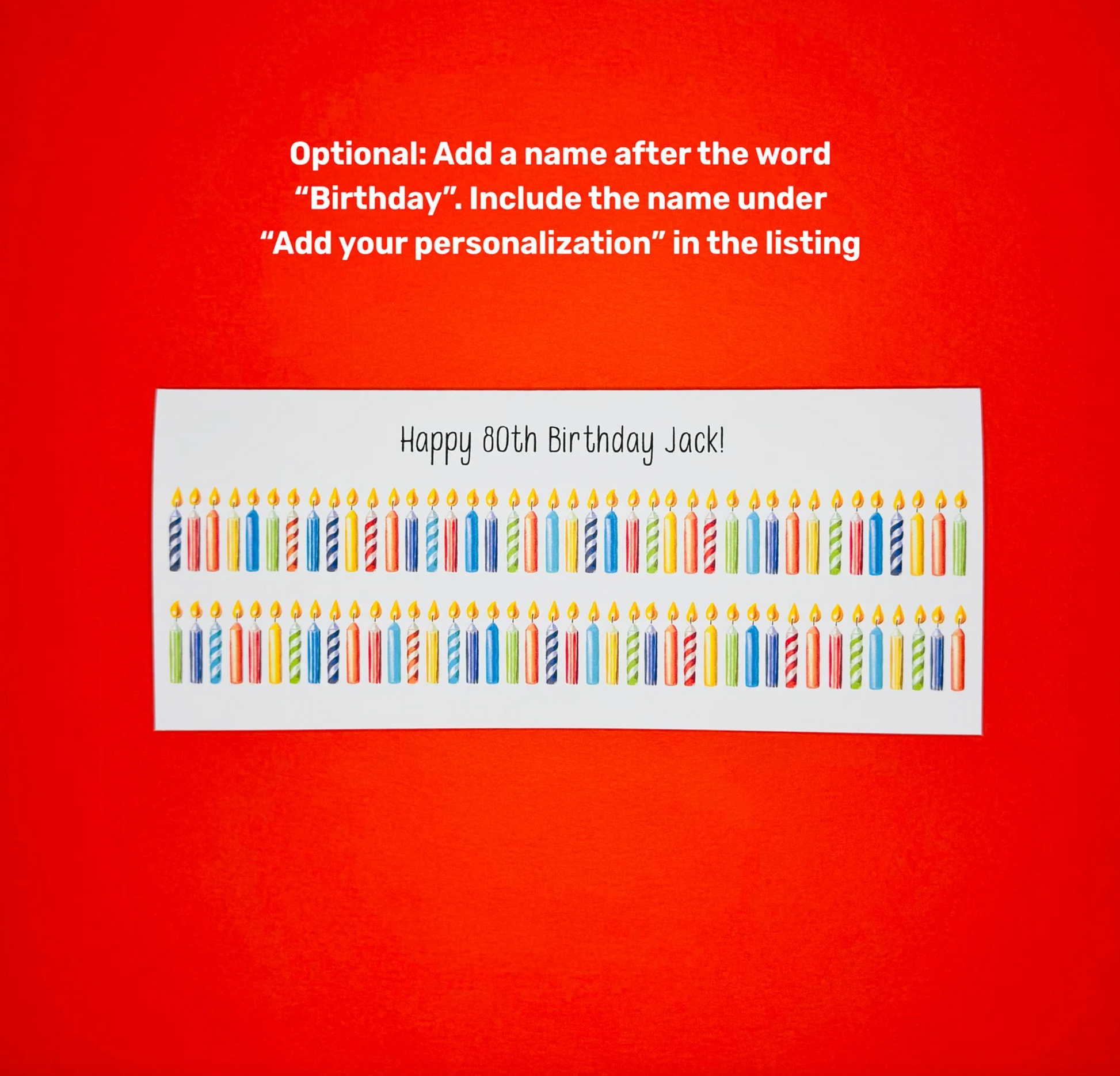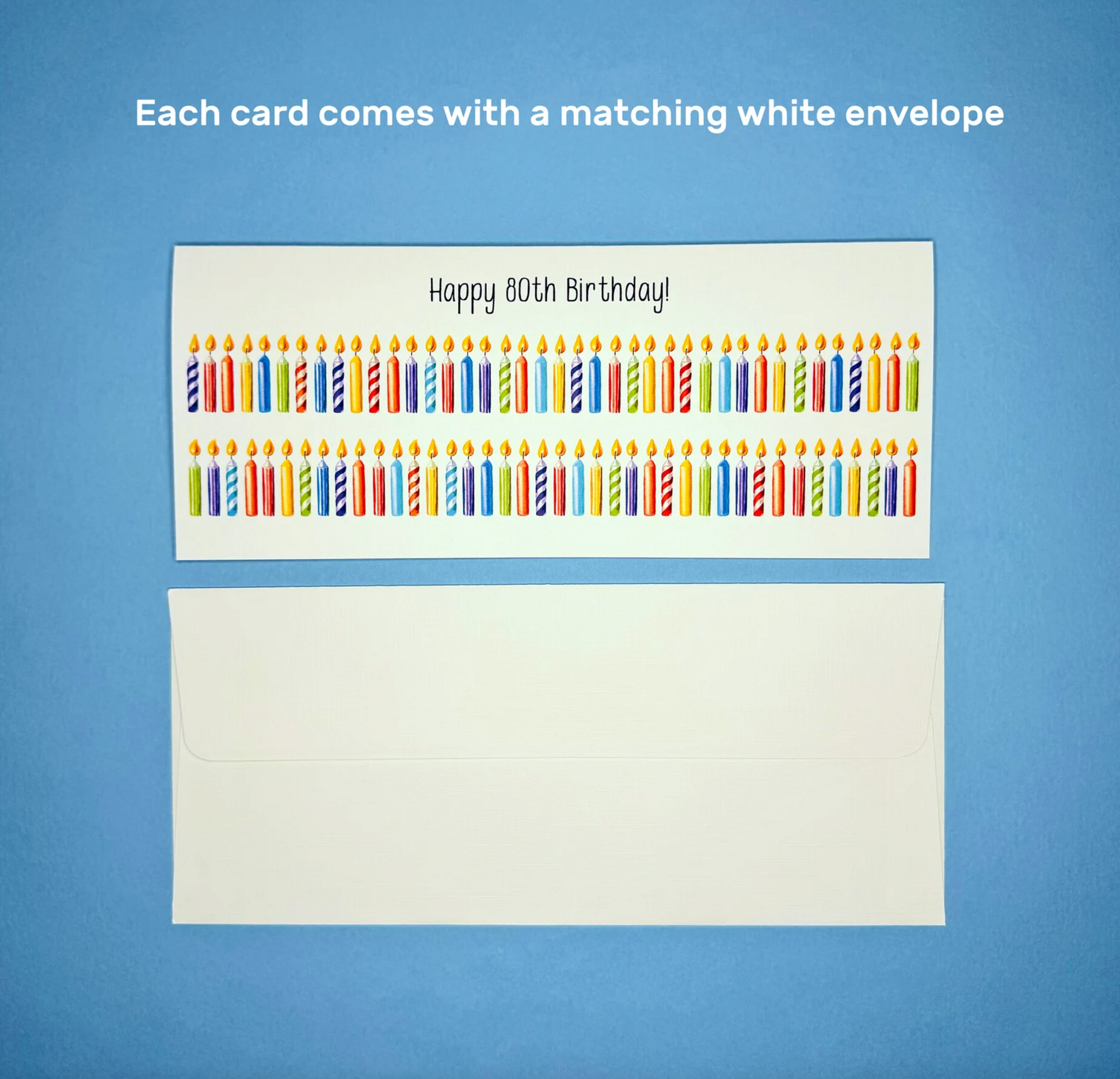 Happy 80th Birthday! That's quite the milestone, and it means a lot of candles! Celebrate with our beautiful watercolor birthday candle design, printed on premium matte white cardstock. Each card comes with a matching white envelope. The front reads "Happy 80th Birthday!" but if you’d like to add a personalized touch, simply include the name under "Add your personalization." The inside of the card is blank, giving you plenty of space to write your own message. If you’d prefer custom printed text inside, please include it under "Add your personalization". Short on time? No worries! I can mail this card directly to your recipient.